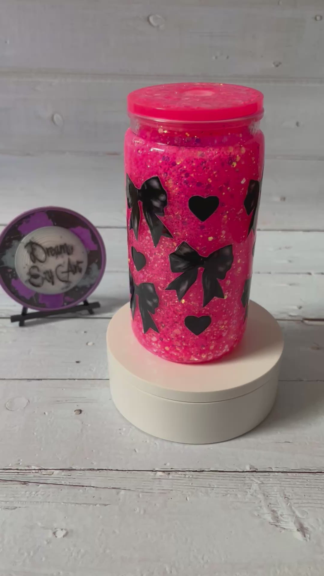 Add a flirty touch to your drink ware with the Black Coquette 16oz Plastic Snow Globe Tumbler! Featuring black coquette bows and hearts design, this playful tumbler sparkles with hot pink glitter inside and is finished with a matching hot pink lid.