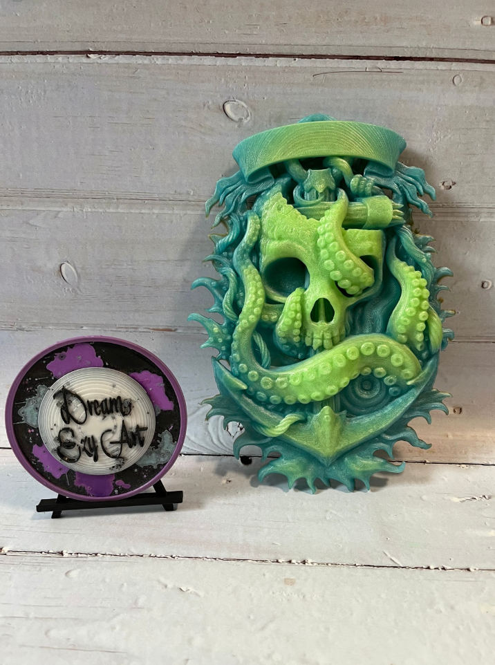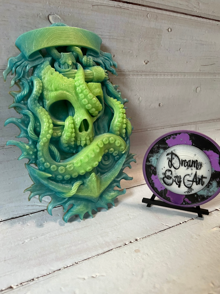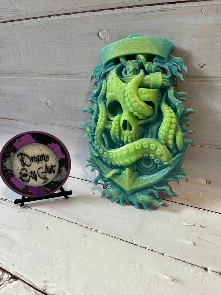 Unleash the depths of the sea with this hauntingly detailed Kraken’s Curse Skull Plaque. This striking piece features a menacing skull entangled in glowing tentacles, wrapped in a swirling sea of intricate textures. With its eerie nautical aesthetic and bold design, it’s the perfect statement piece for fans of pirates, sea monsters, or gothic décor.
