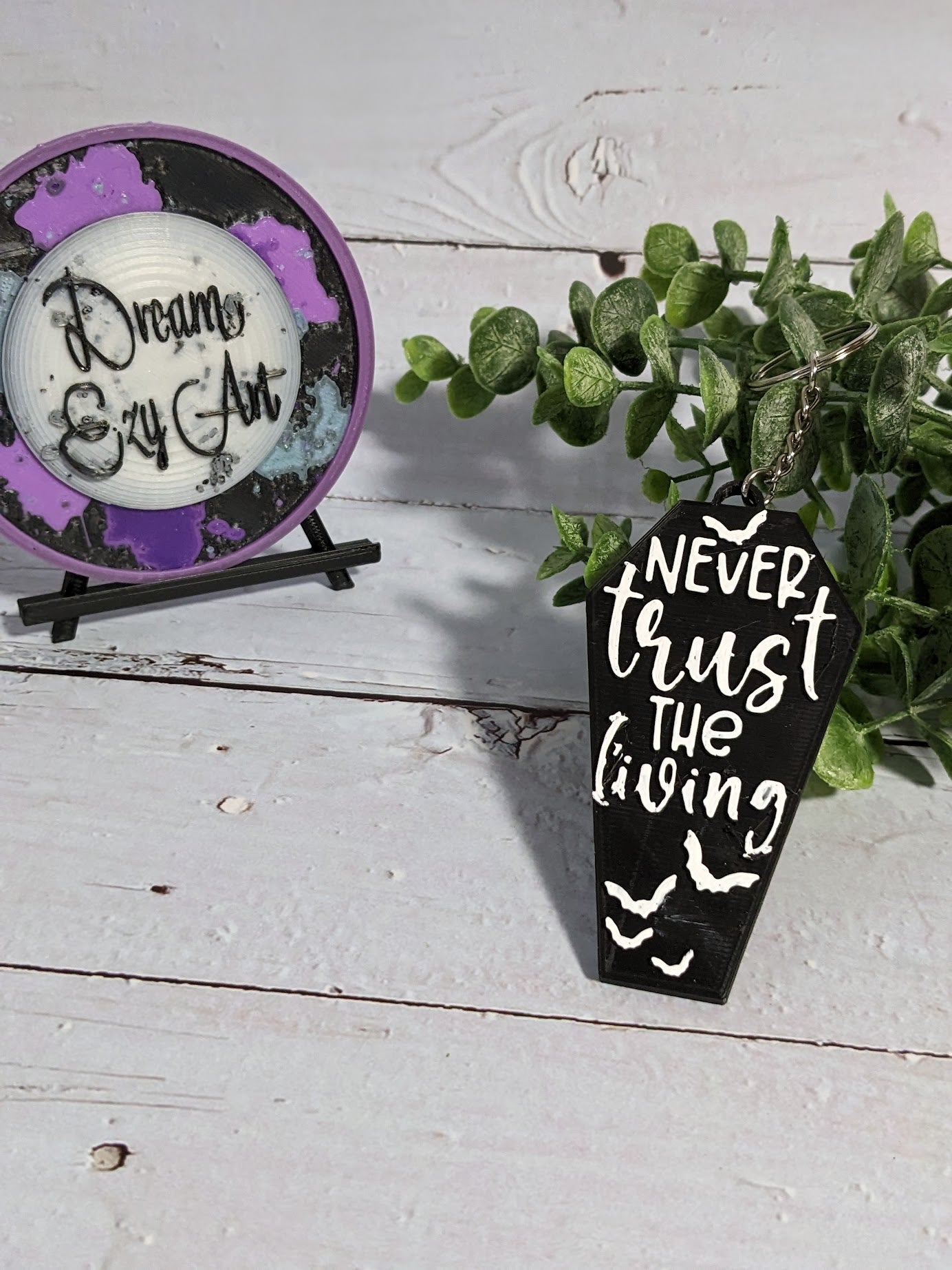 Get a grip on the undead with the RTS Never Trust The Living Keychain. Featuring "Never Trust The Living" on a coffin-shaped base and bat decor, this keychain is perfect for anyone with a dark sense of humor.