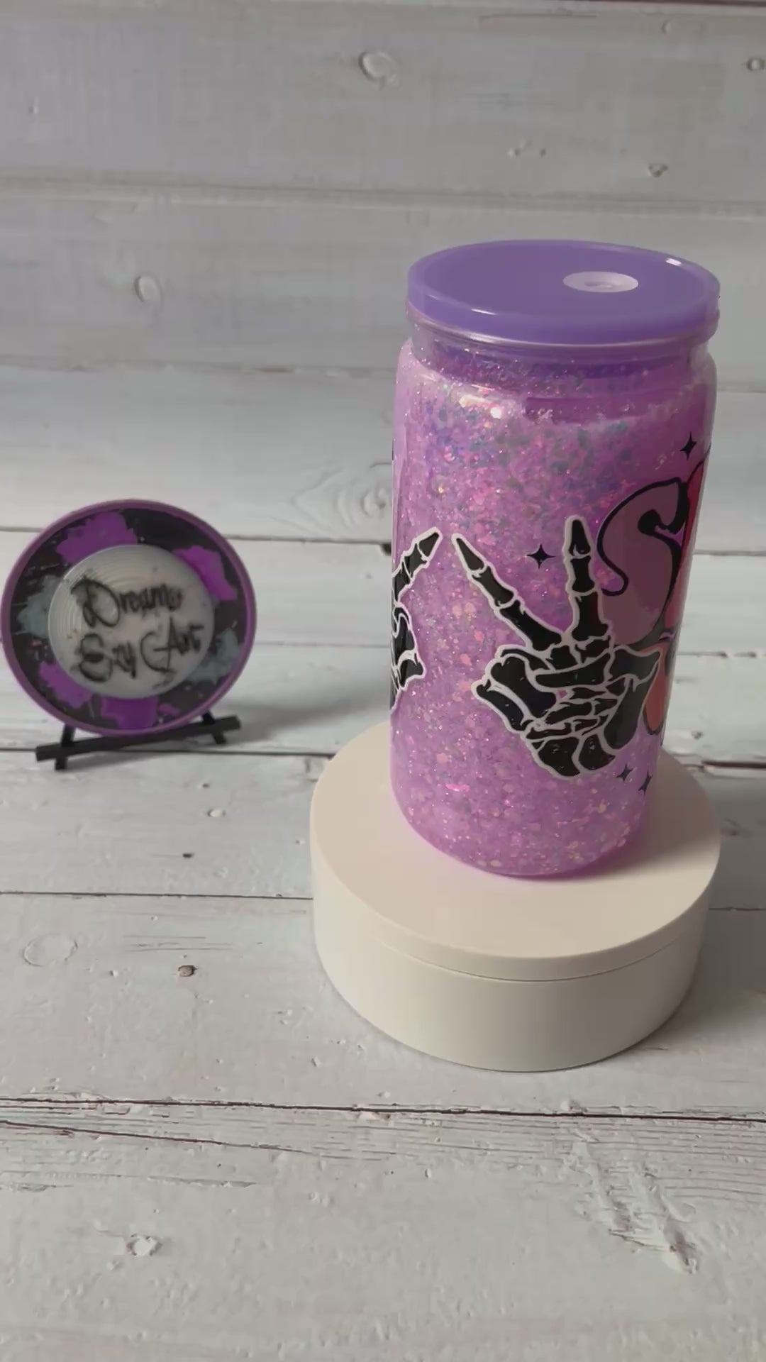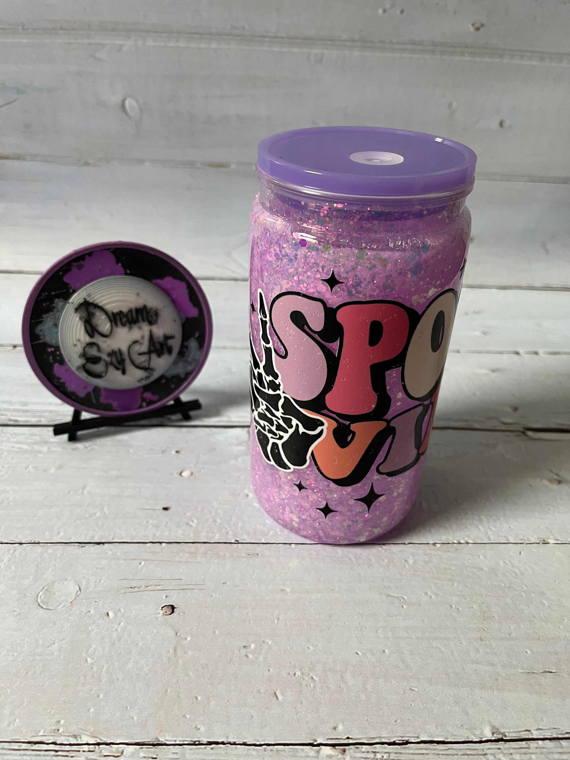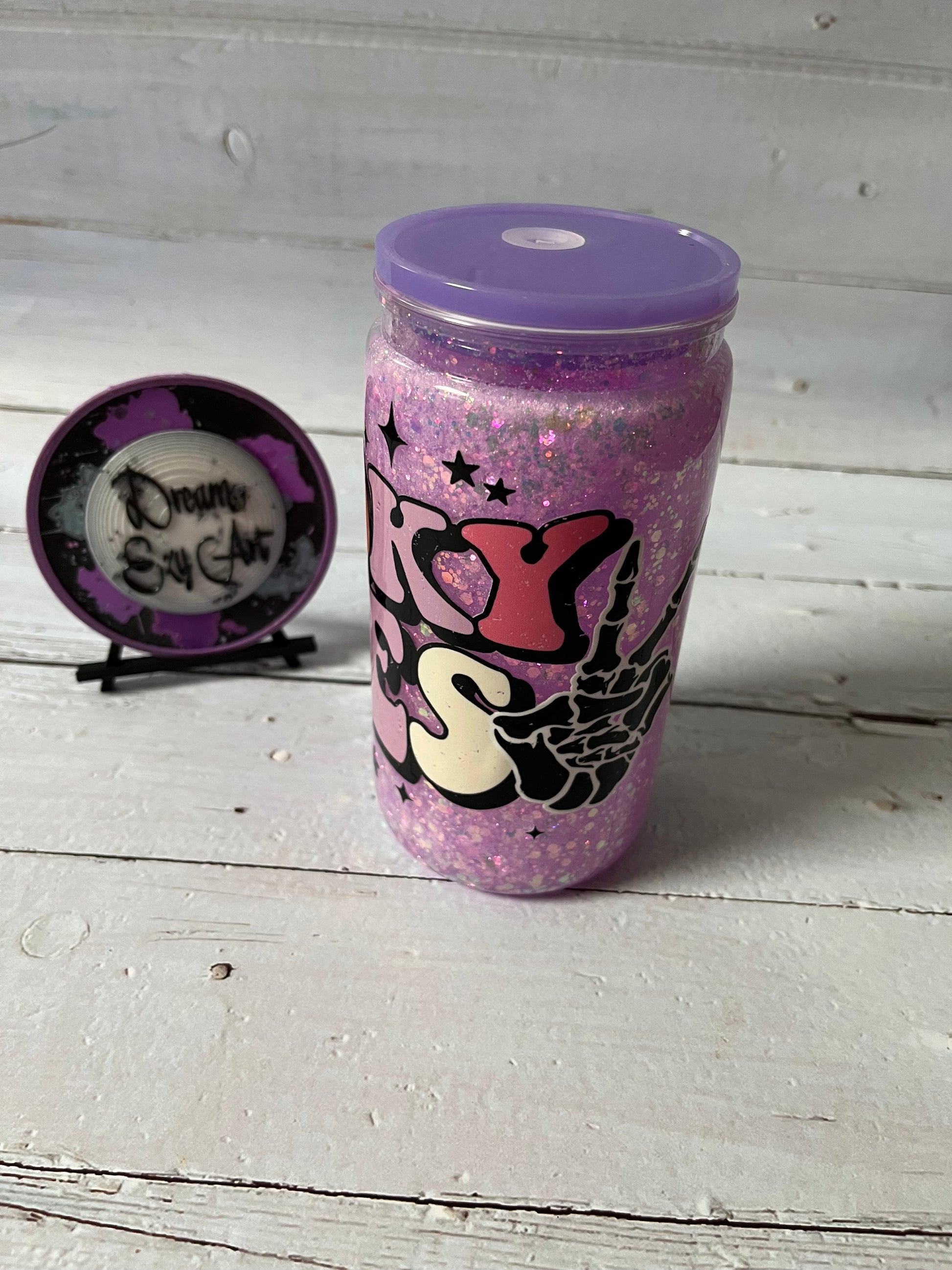 Get into the Halloween spirit with the Spooky Vibes 16oz Plastic Snow Globe Tumbler! Featuring skull peace hands and shimmering purple glitter inside, this playful tumbler adds a fun, spooky twist to your favorite drinks. Perfect for sipping with a side of spooky style all year round!