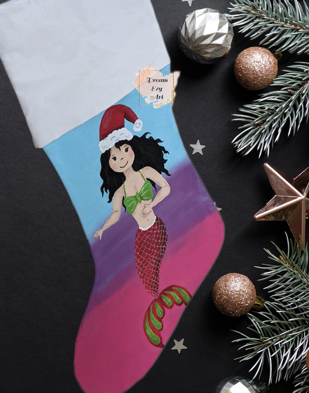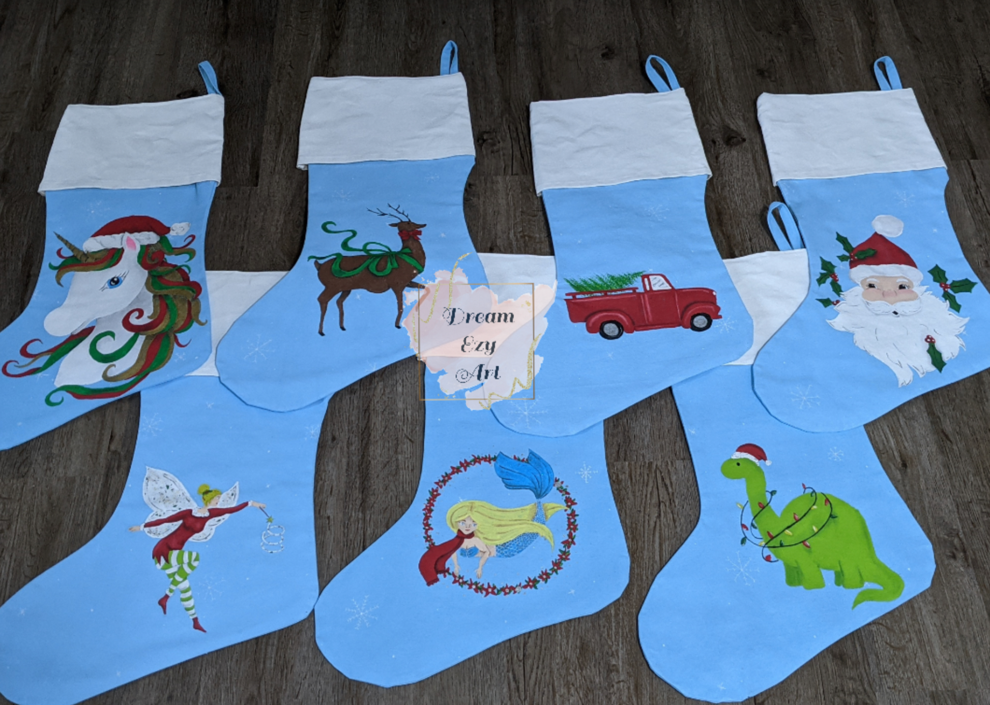 Our hand-painted Christmas stockings are perfect for adding a special touch to your holiday decor, whether you hang them from your mantle or use them to hold gifts for your loved ones. Each stocking is made with care and attention to detail, ensuring that you receive a high-quality and unique product. If you have a custom design or idea in mind, we are also happy to work with you to create a one-of-a-kind piece.