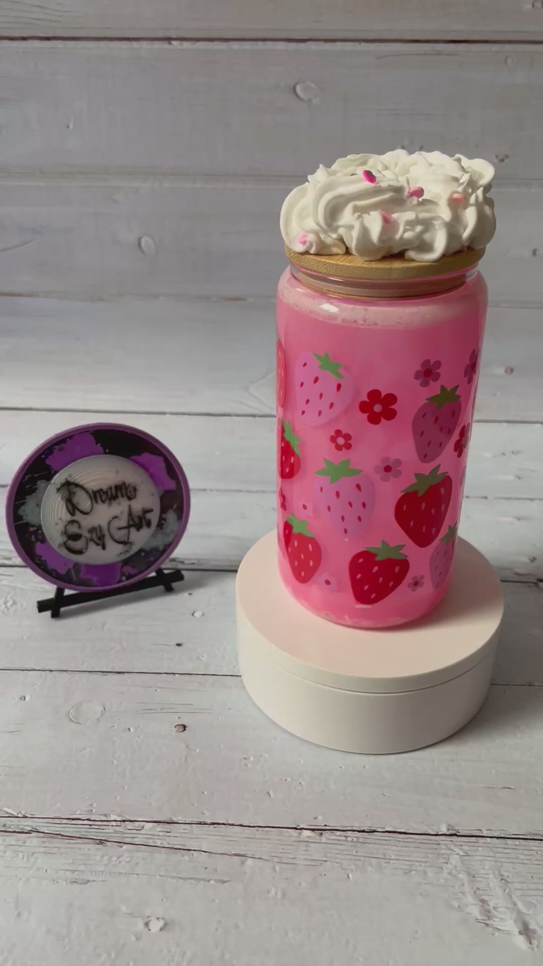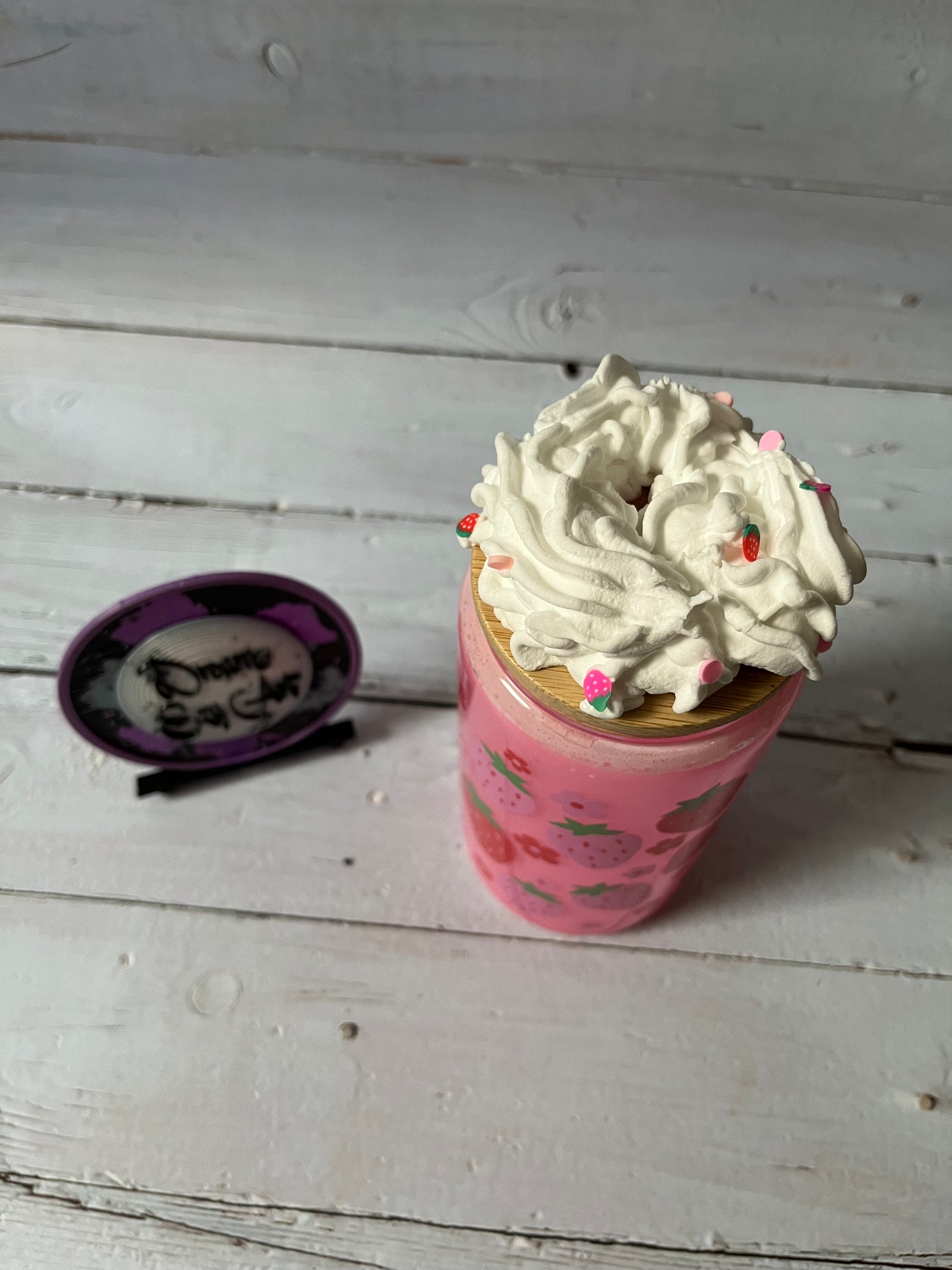Enjoy a sweet sip with the Strawberries & Cream 16oz Glass Snow Globe Tumbler! Topped with a whimsical whipped cream lid and strawberry sprinkles.