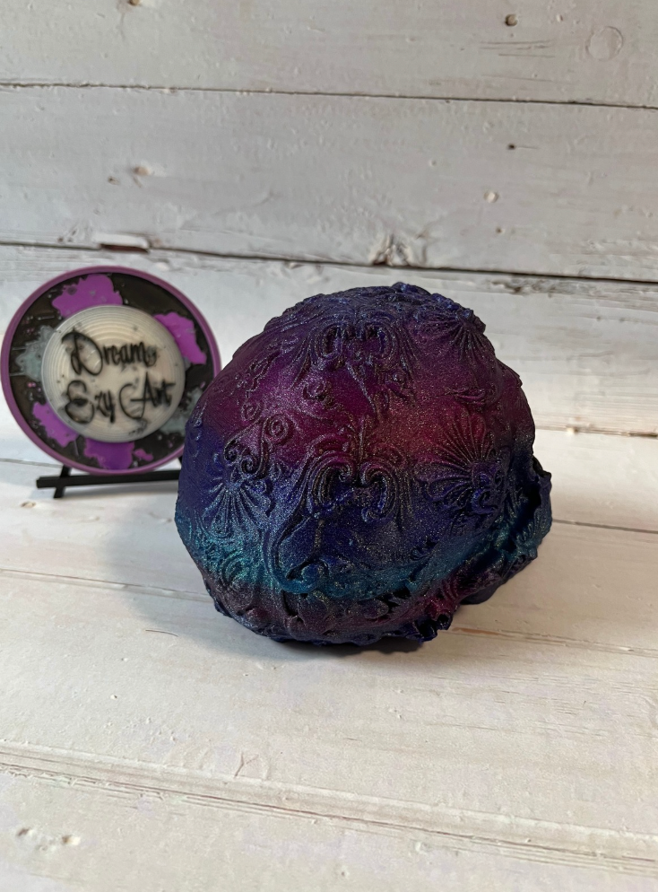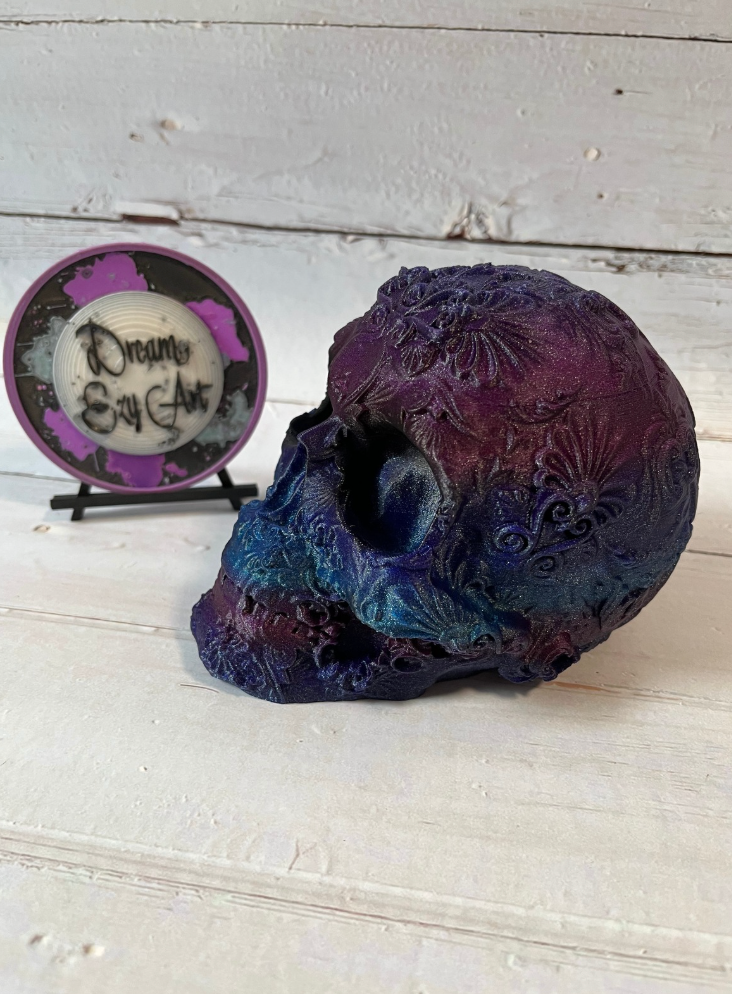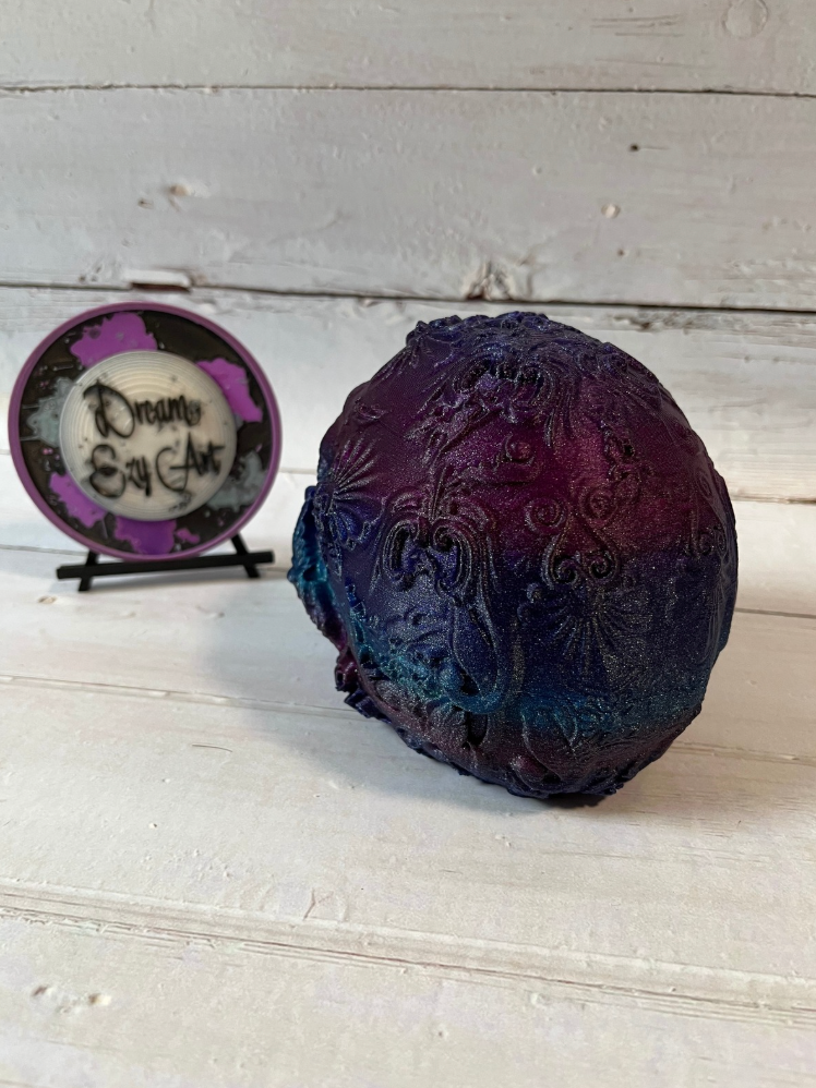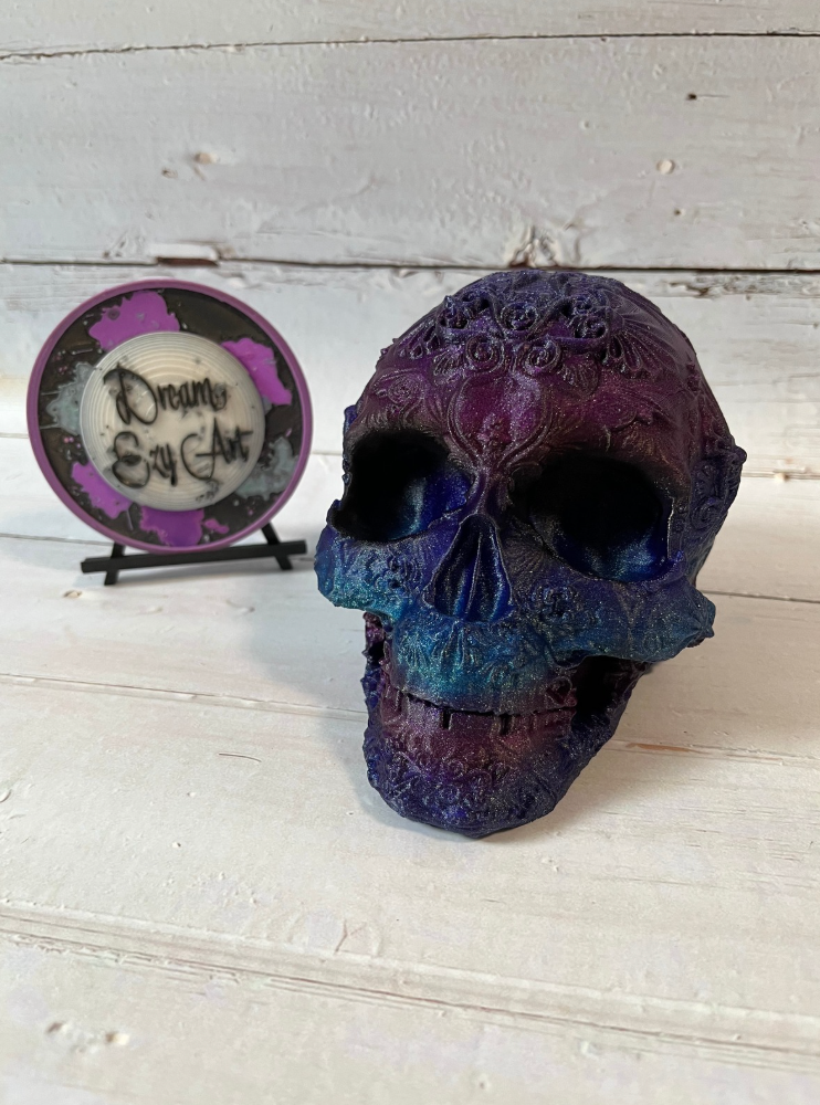 Intricate floral embossing on the crown adds an elegant detail, while the sparkling gradient finish creates a striking visual from every angle. Perfect as a gothic home accent, altar centerpiece, or conversation starter, this skull blends spiritual symbolism with artistic flair.