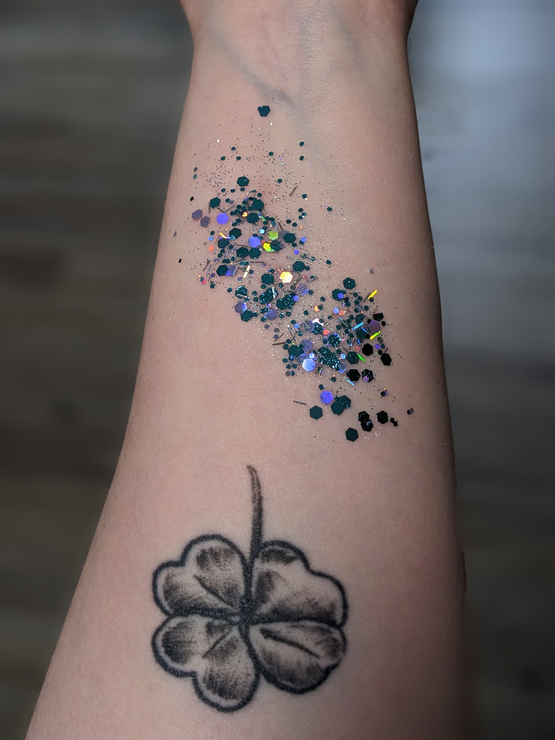 Appearance depends on amount applied. Everyone has their own style and while these are Glitter Hair Gels, they can be used on skin!