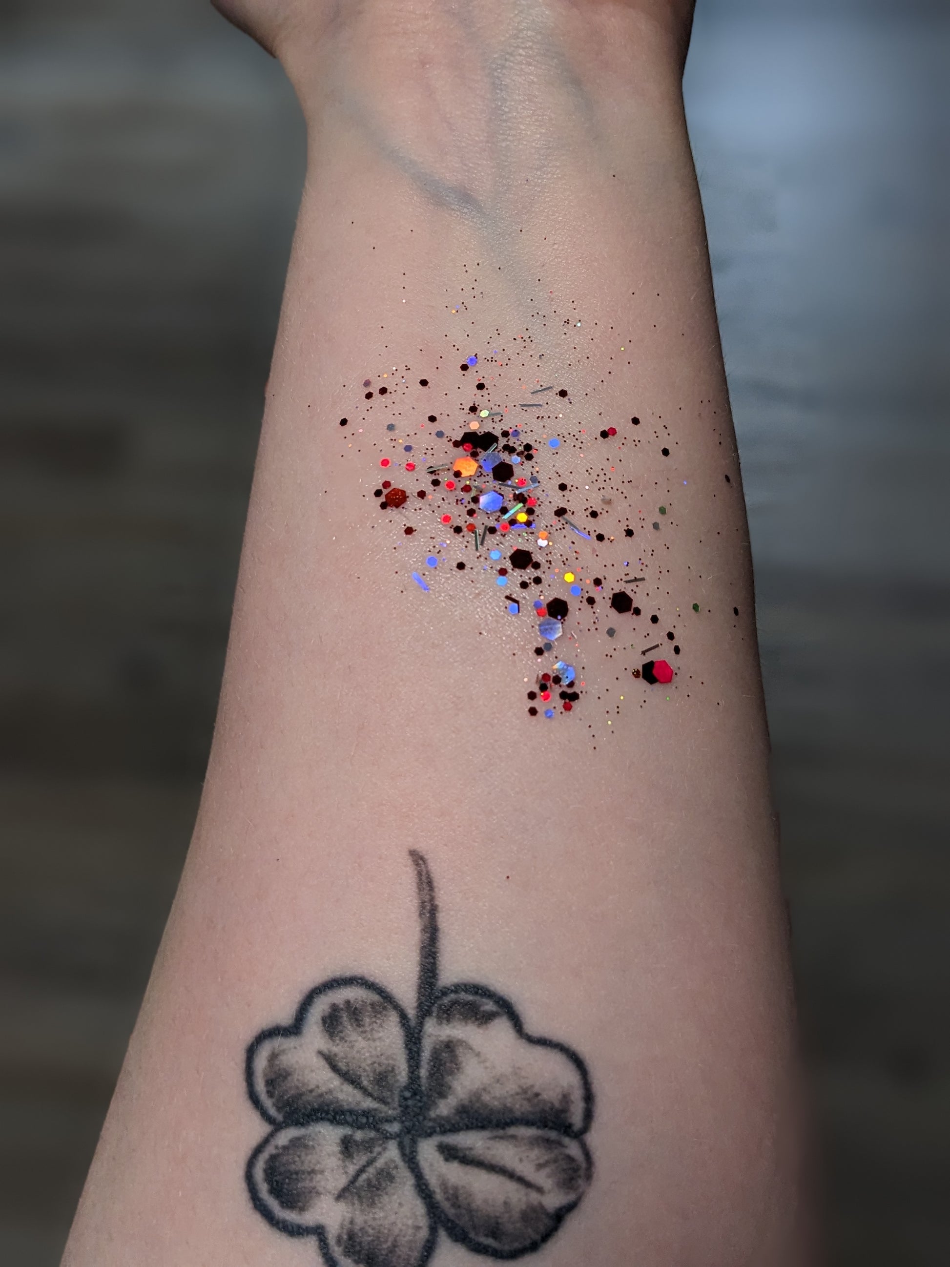 Appearance depends on amount applied. Everyone has their own style and while these are Glitter Hair Gels, they can be used on skin!