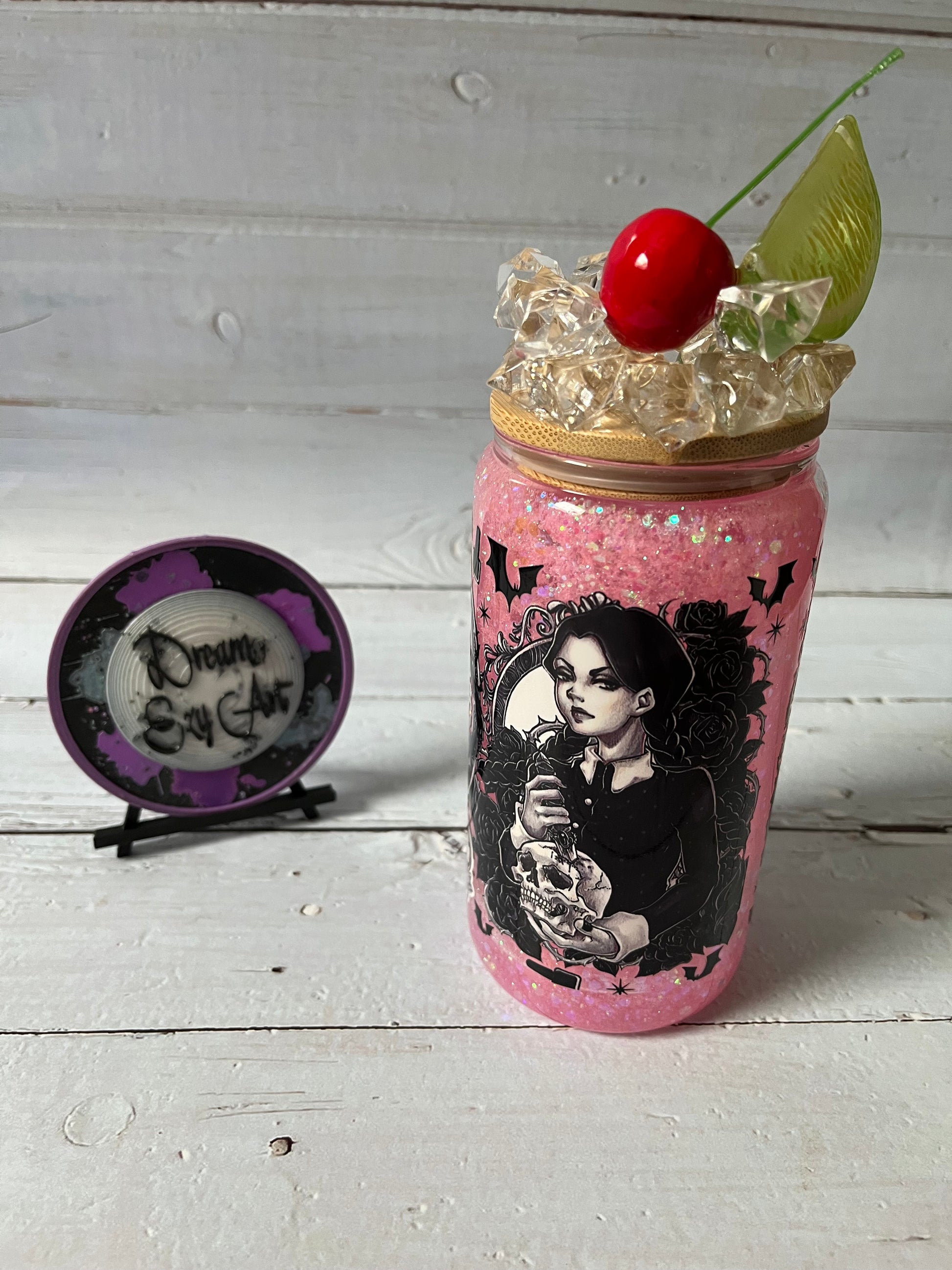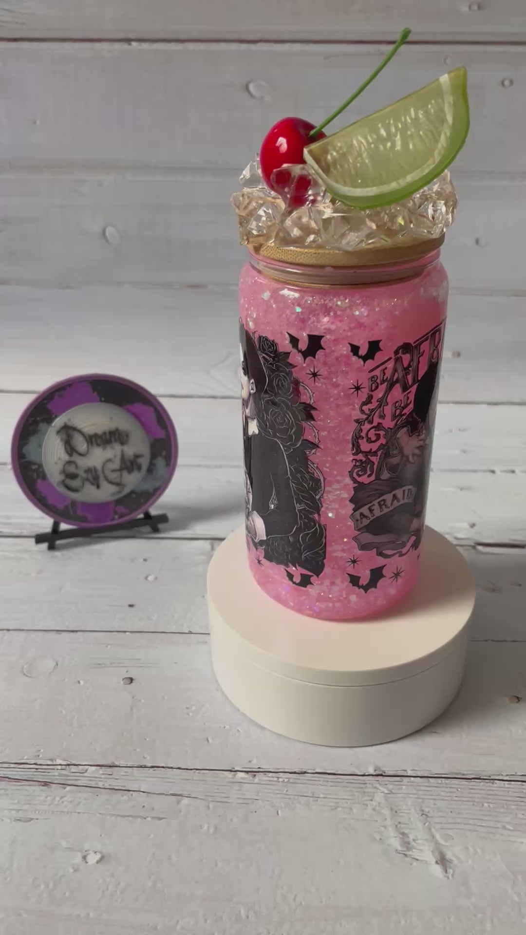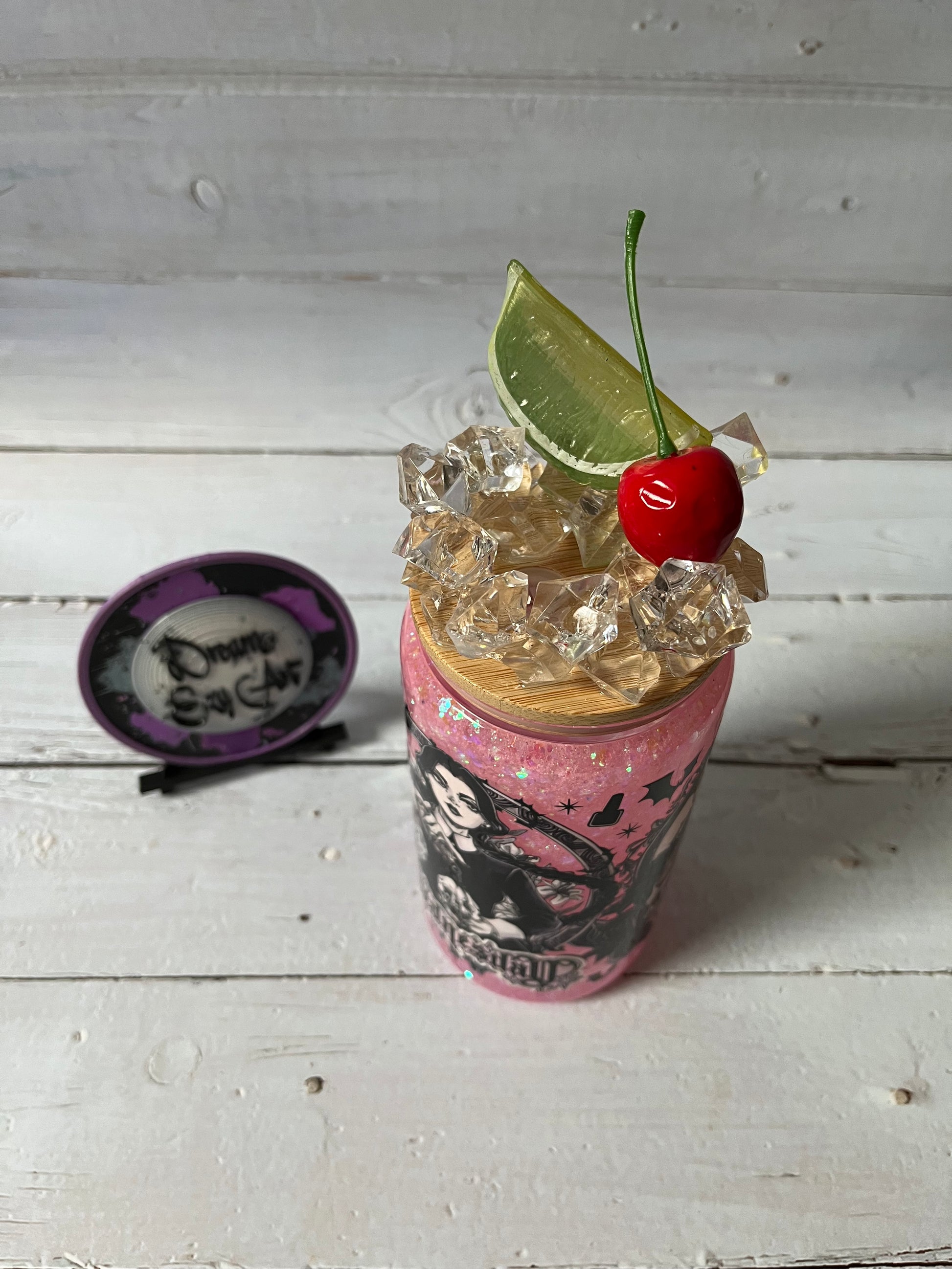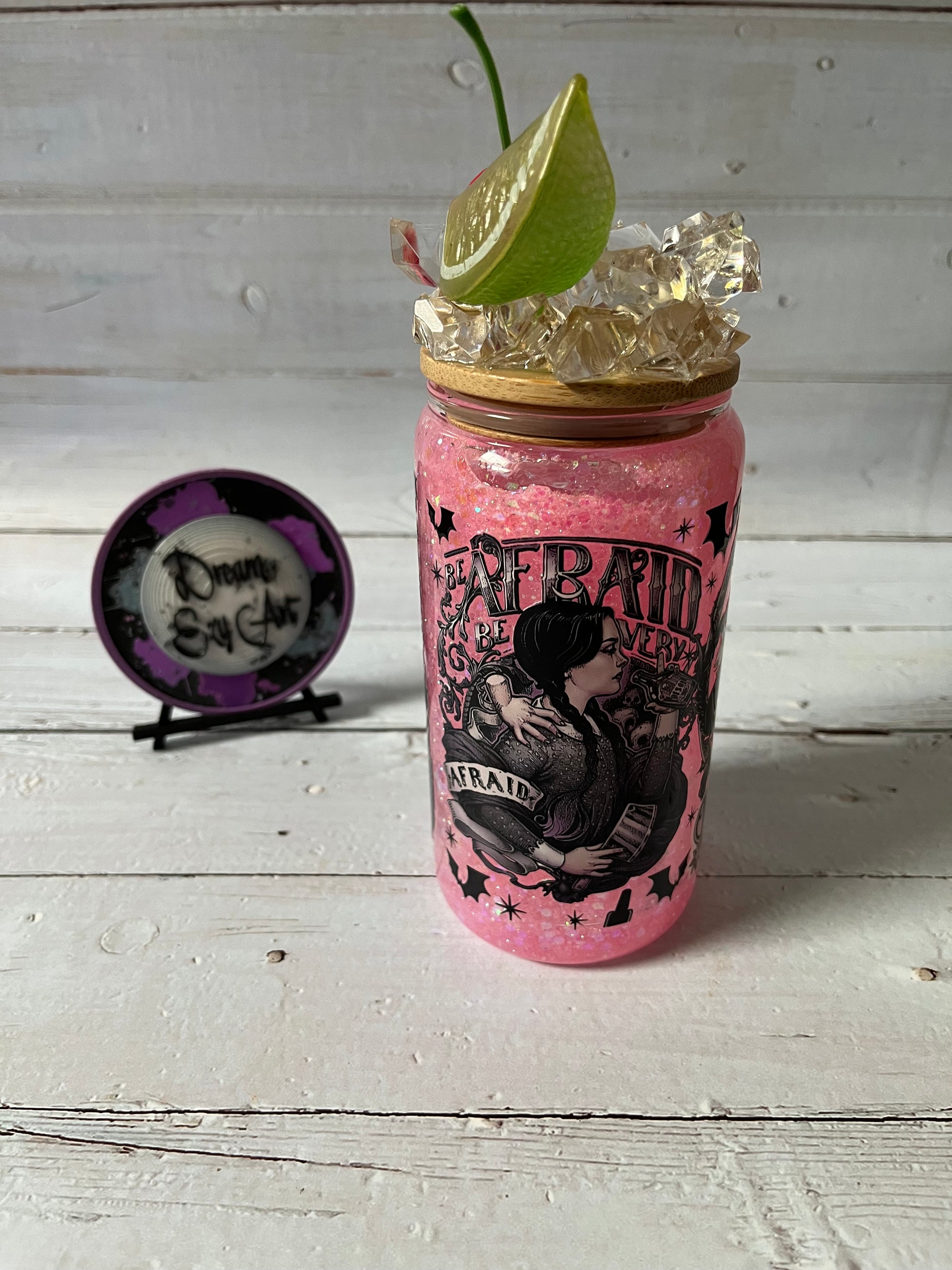 Embrace your dark side with the Wednesday 16oz Glass Snow Globe Tumbler! Featuring a bold Wednesday Adams design and the spooky "Be Afraid Be Very Afraid" quote, this tumbler sparkles with pink glitter for a playful twist. Topped with ice chips, cherry, and lime, it’s perfect for sipping with a touch of mischief and style.